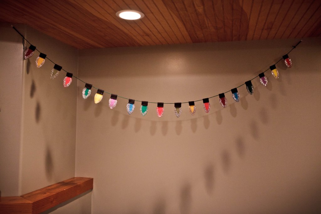 Then I cut out a lot of black rectangles and glued each side to the light bulb so there was a space in the middle of the rectangle. The reason for the space was to string some yarn through them and make garland! So just make sure the space is big enough to easily string the yarn, and the lights will pretty much stay in place. I also decided to add some glitter around the light bulbs (using Mod Podge) just to give them that extra sparkle!