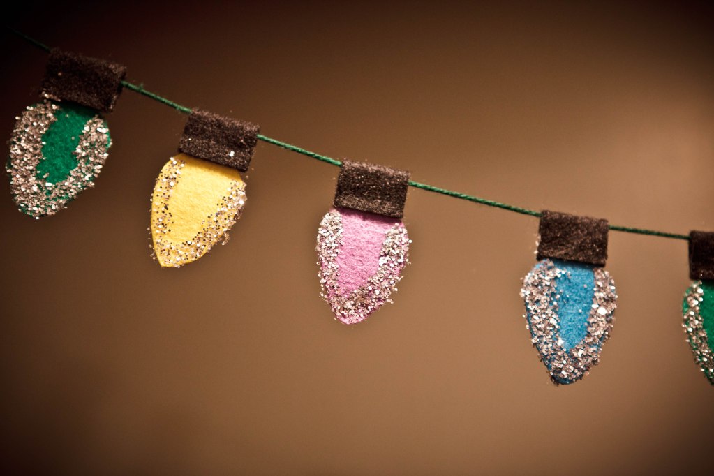 First, I traced lots of little lightbulb shapes out of different colors of felt. You can find templates online. I made an extra space at the top of the bulb to glue on the other part.